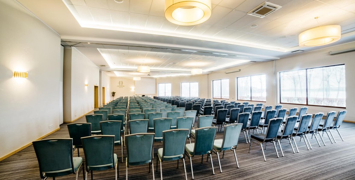 Klimatyzowana sala o powierzchni ponad 300 m² z widokiem na jezioro, z możliwością mobilnego podziału na trzy części /bez kolumn/. Wysokość sali to 4 m.